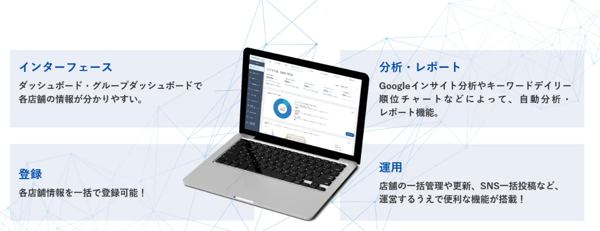店舗情報一括管理から分析・集客まで、全ての機能を搭載!