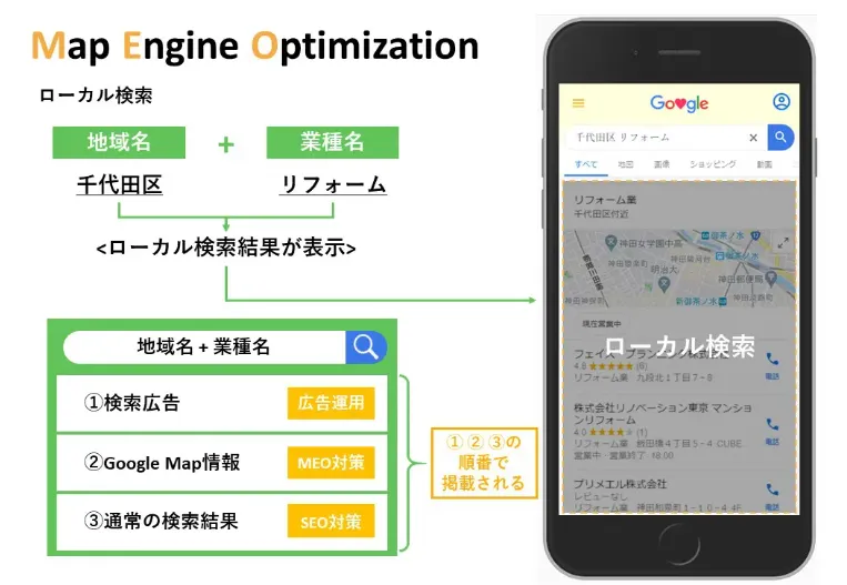 Googleマップエンジン最適化のことで、Googleマップに登録されている店舗/事業所の検索順位を上昇させる施策になります。